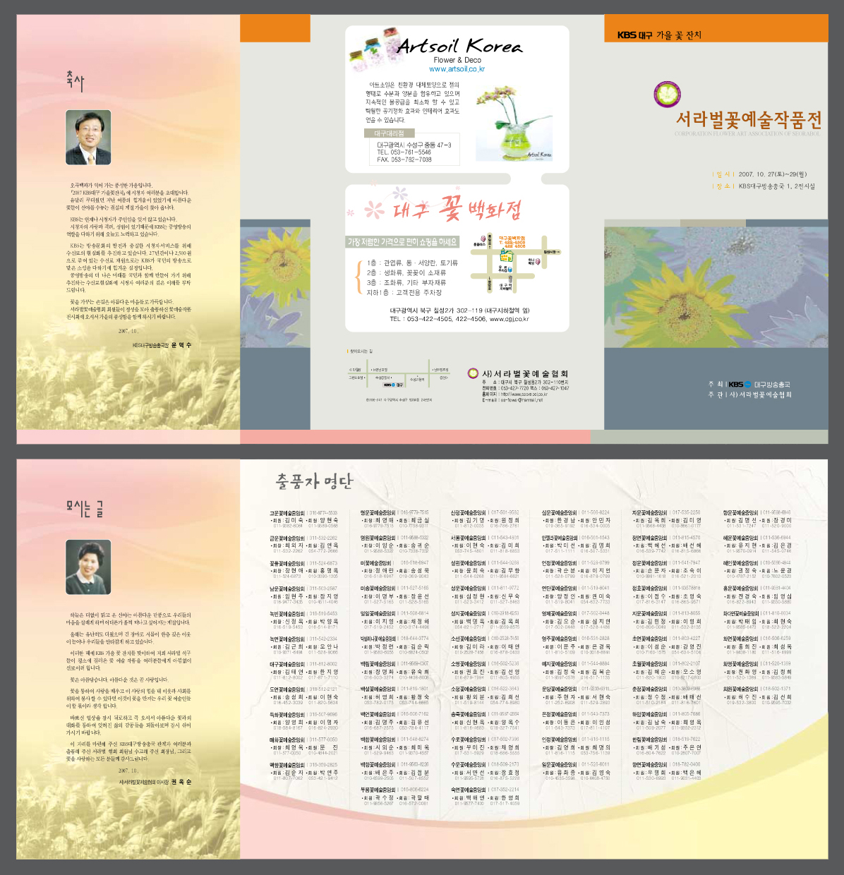 원래 첨엔 저두 카키계열주황으로 했었는데요 작품전하시는분들이 대부분 40대에서 50대여자분들이세요. 표지가 전체적으로 죽어보인다시면서 빨간주황으로 해돌라구 하시더라구요. 안어울리는것 같다고 해도 막무가내로 해돌라시니 .....에휴~~ 컬러님 생각이 저랑같은거보니깐 제생각만은 아닌것 같아 기분이 좋네요..